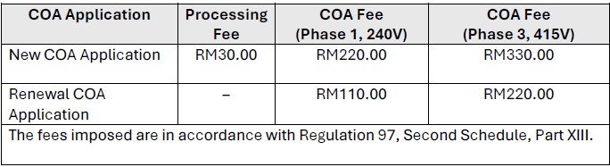 The fees are charged based on the type of Certificate of Approval and the equipment phase as follows: